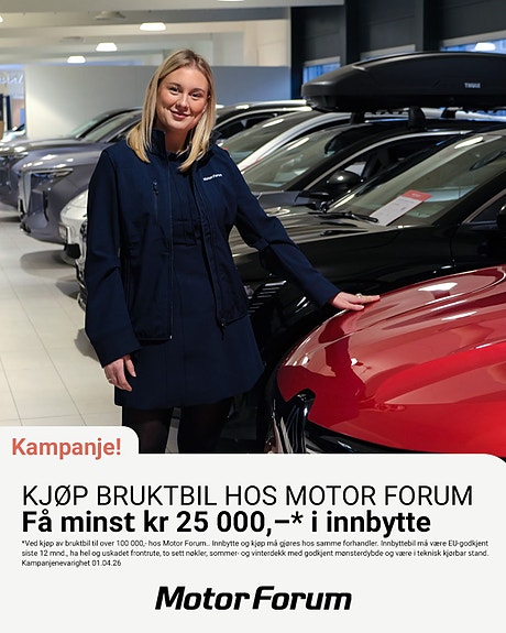 *Ved kjøp av bruktbil til over 100 000,- hos en av våre forhandlere. Innbytte og kjøp må gjøres hos samme forhandler. Innbyttebil må være EU-godkjent siste 12 mnd., ha hel og uskadet frontrute, to sett nøkler, sommer- og vinterdekk med godkjent mønsterdybde og være i teknisk kjørbar stand. Kampanjevarighet 01.04.26