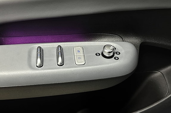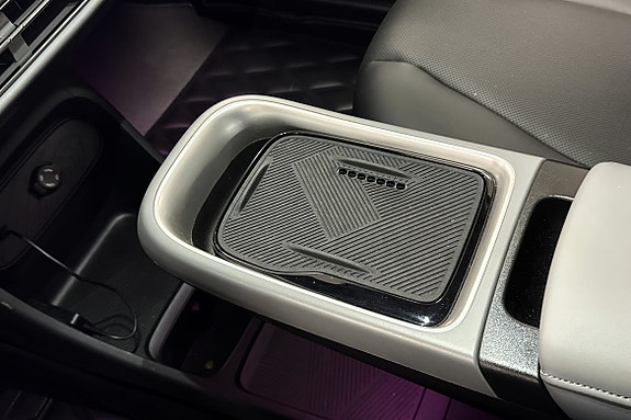 Sentral konsoll med trådløs lading og stemningsfull belysning.