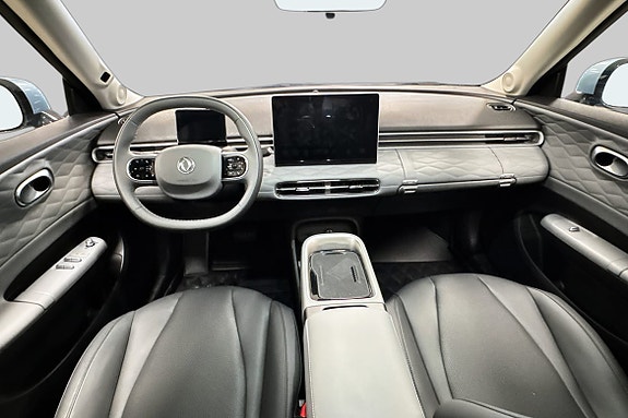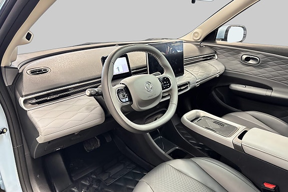 Førerorientert dashbord med doble skjermer og skinnseter.