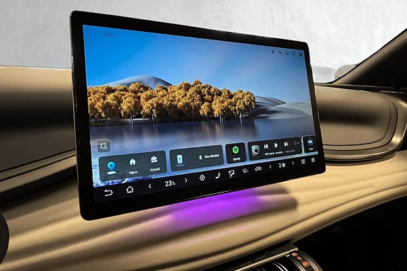 Multimediaskjermen kan settes stående eller liggende, og er enkel å navigere med store tydelige symboler det er lett å treffe selv i fart. De mest brukte funksjonene er på første vindu, de andre appene er bare et sveip unna. Man velger fort en strømmetjeneste, enten via blåtann, den innebygde Spotifyen, Android Auto eller Apple CarPlay via ledning. Du kan også justere både kjøreprogram, regenerering, varsler, filholder og varsellyder i menyer og knapper.